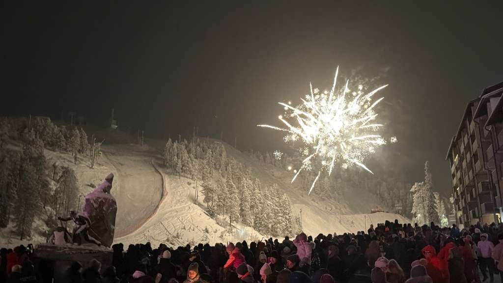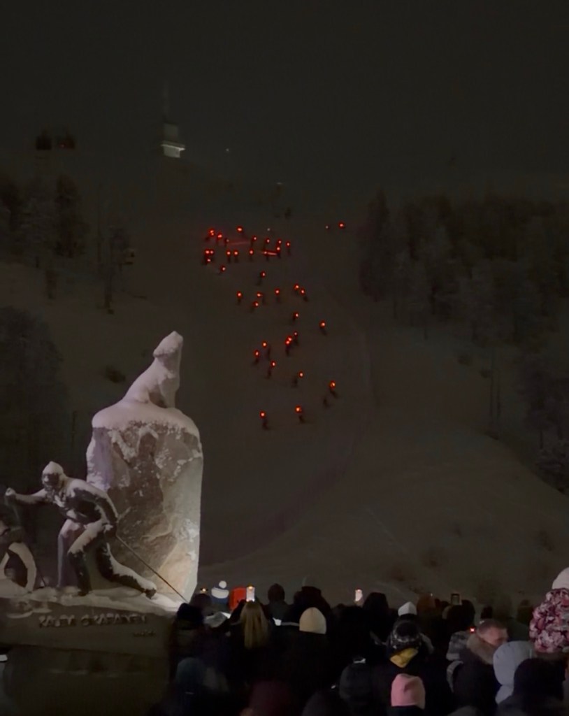 Around 11:45 p.m., we stepped outside for the New Year’s festivities. Just minutes before midnight, the celebration began with a torchlight ski down the front of the slopes, the crowd erupting in cheers as the skiers glided back into town.