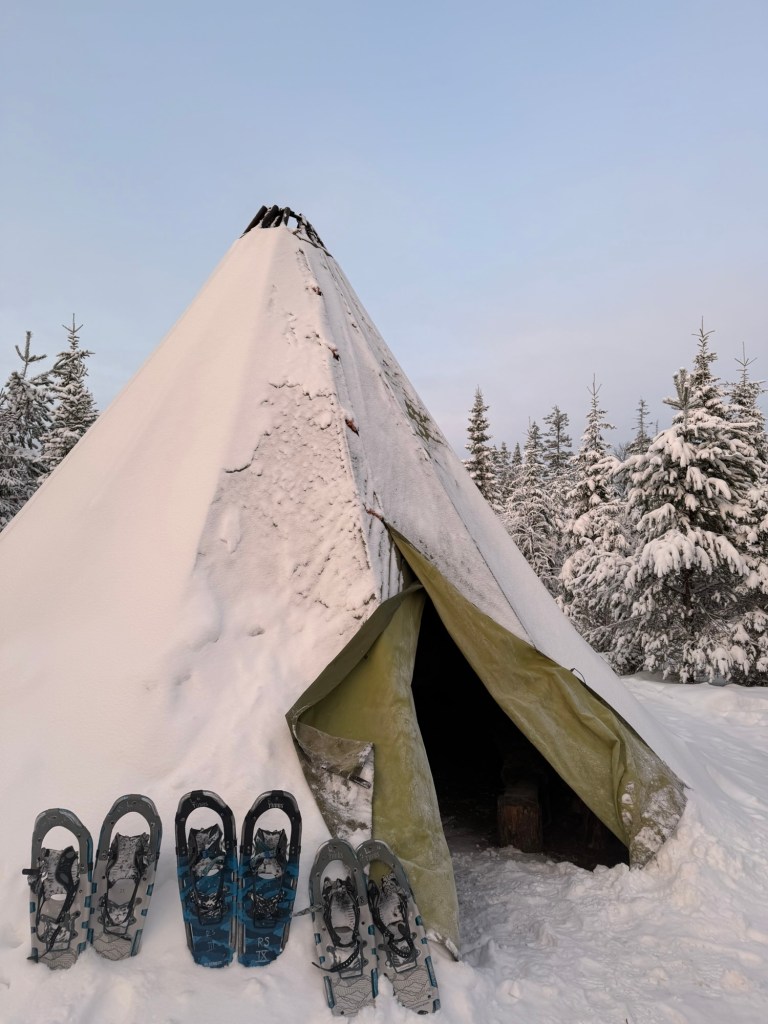 Halfway through our hike, we arrived at a teepee, where Salla had built a fire and was warming buttered sweet buns and hot apple cider for us. She had carried the rolls, cider, and traditional Finnish cups—called a kuksa—in her backpack the entire hike! She explained that people often forget to drink water in winter because they aren’t sweating, even though dehydration is still a risk—a reality for several of us on the trip. The hot apple cider and warm buns were exactly what we needed to refuel before hiking back to the hut where we started.