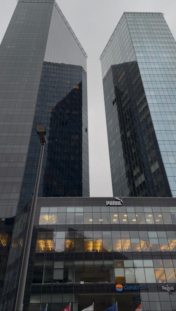 When the tour was over, we realized we needed to visit a sporting goods store. Somehow, we always end up shopping in one while on vacation, and this time, one of us had lost a pair of gloves and another had forgotten a balaclava for skiing. With temperatures dropping below freezing in Finland, these were definitely essentials. We took another Bolt taxi to the store, which turned out to be in the heart of the business district, giving us a chance to admire the towering skyscrapers from street level.