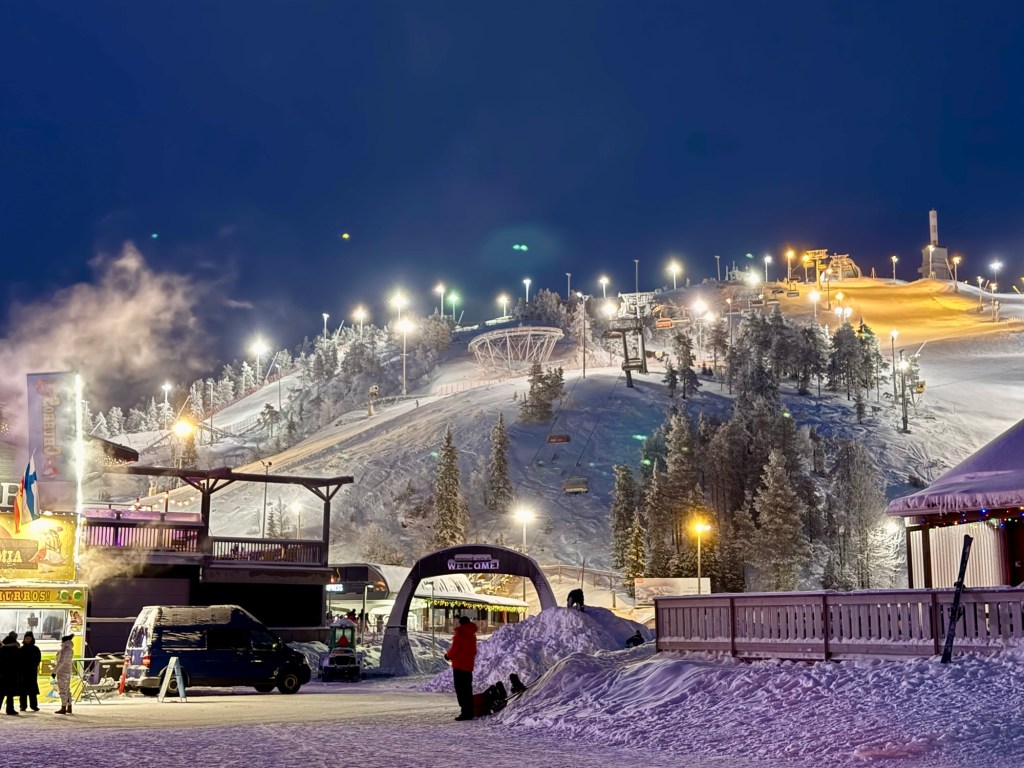 After about an hour and a half, we landed in Kuusamo and walked straight off the plane, onto the runway, and out of the airport in about a minute. It was noticeably colder here- about -16c so we quickly found our bus to the ski resort and hopped on. It was about a half-hour ride to the ski resort, where we promptly stored our luggage and changed into our ski clothes.