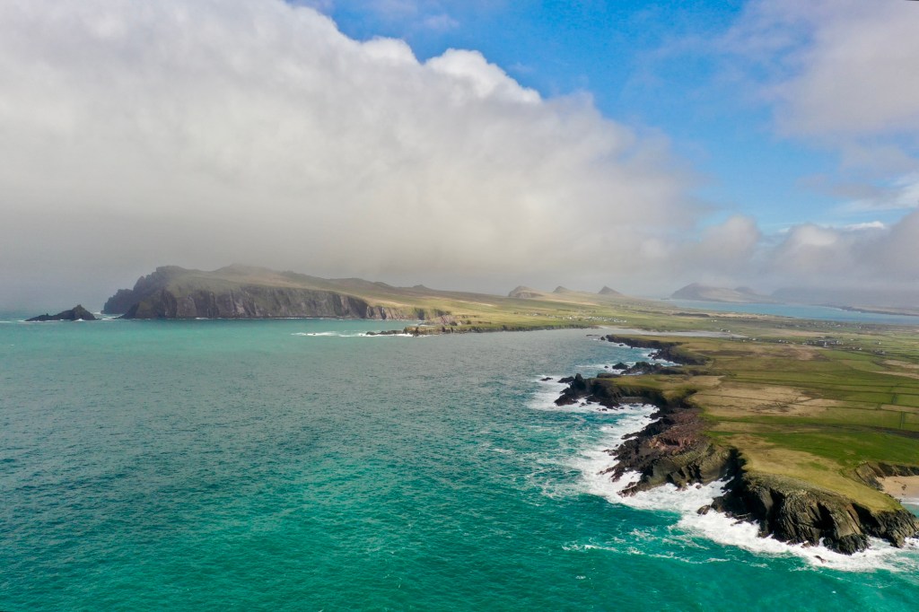 Just as we reached our first major stop at Slea Head, the weather began to shift. The clouds slowly lifted, the rain eased, and patches of sunlight broke through. Matt took the opportunity to send his drone into the air, capturing dramatic views of the cliffs as they emerged from the mist.