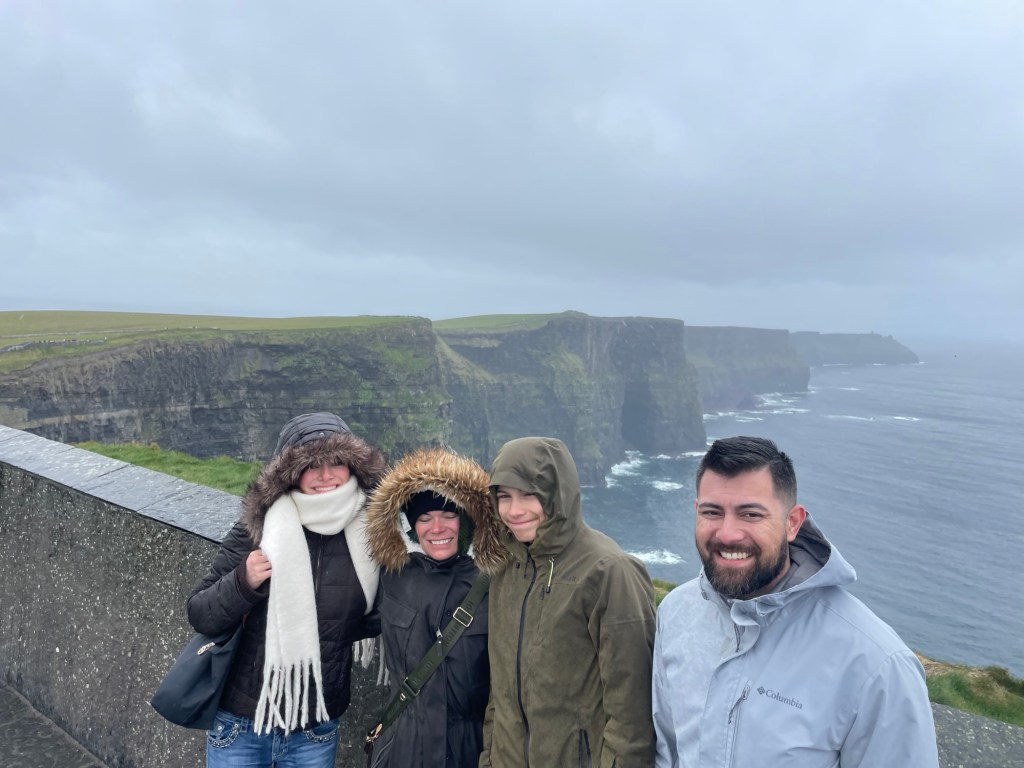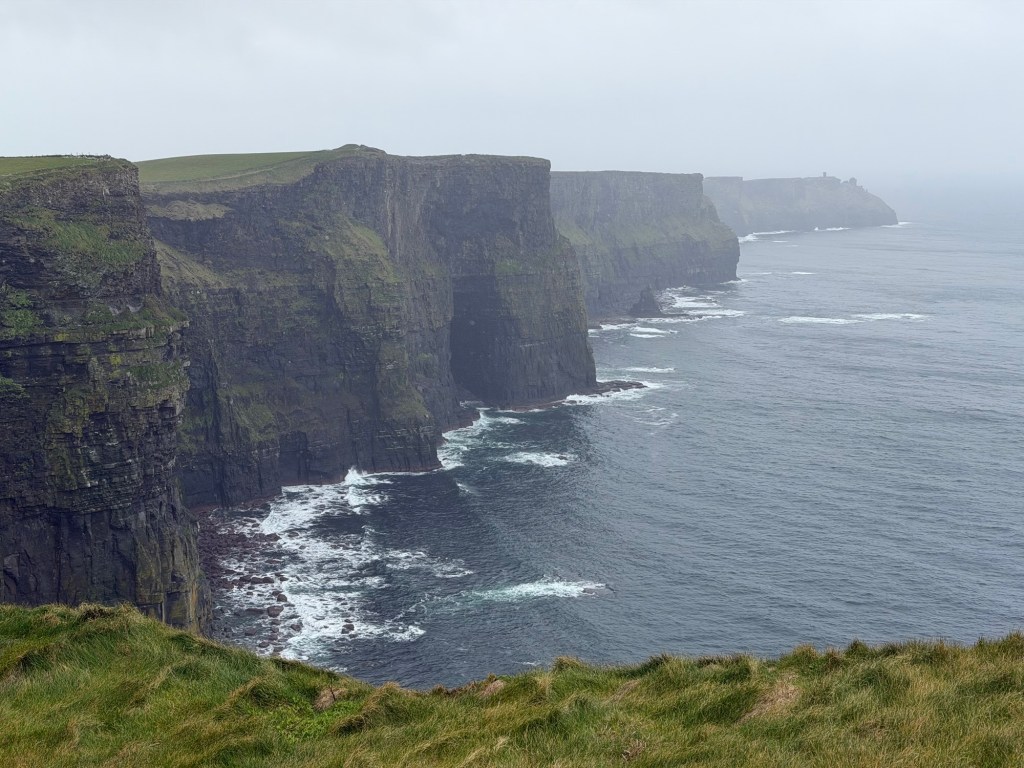 After about three hours, we arrived at the Cliffs of Moher. The weather, however, had other plans. Rain poured down and a thick haze hung in the air, obscuring much of the view. It wasn’t quite the dramatic reveal we had imagined, but we made the most of it, visiting the visitor center and walking along the cliff path. Even through the mist, you could sense just how spectacular it must be on a clear day.