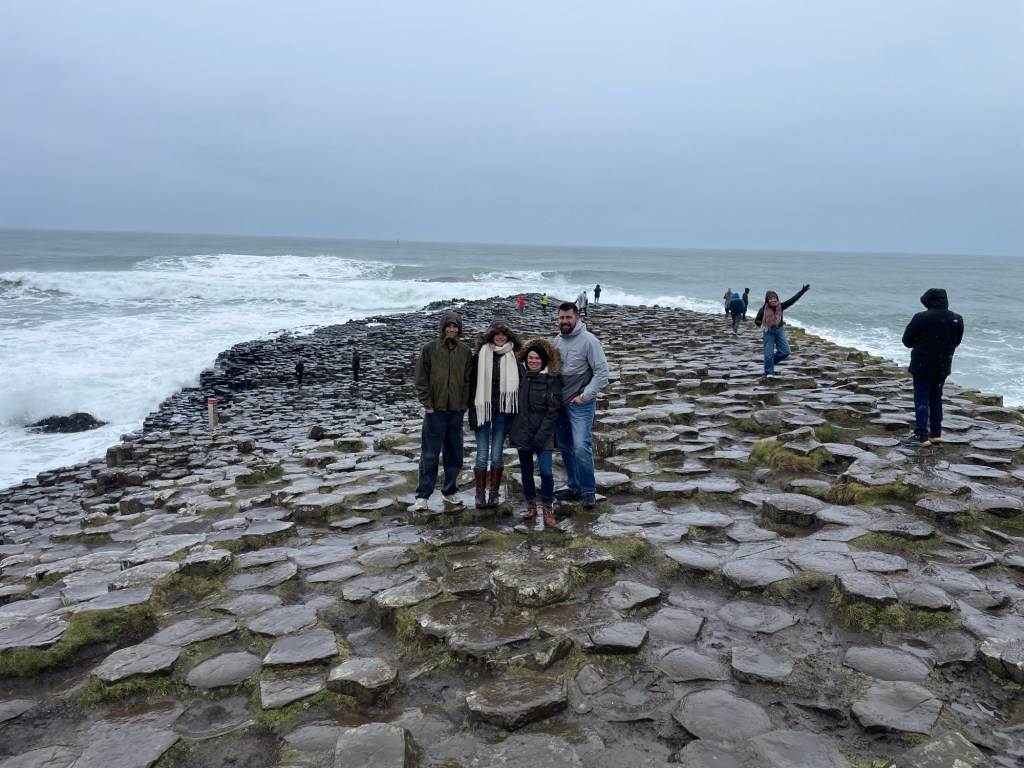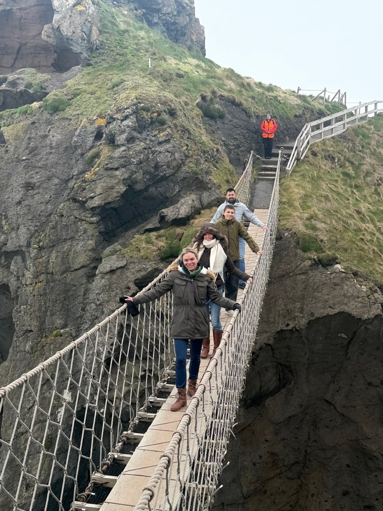 The next morning was our final full day in Ireland. After a hearty breakfast, we loaded up the van and set off along the coast. The storm had passed, leaving behind cooler air and occasional drizzle, but we caught a welcome break in the rain as we arrived at Carrick-a-Rede Rope Bridge. The short mile hike out was peaceful, and we were among the first to cross. Suspended above the crashing water, the bridge was both thrilling and a little nerve-wracking, but the views made it unforgettable. By the time we headed back, a long line had formed, and we were glad we had come early.