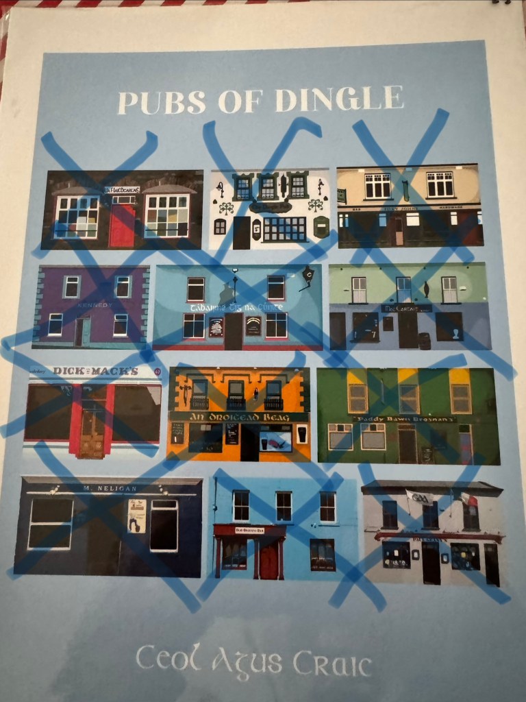 Since Dingle is famous for its pub scene and our kids were more than tired of us after almost a week together, we planned our own version of a pub crawl for the afternoon. Earlier, I had picked up a print of Dingle’s pubs from a local art shop, and we used it as our guide. It felt a bit like a treasure map, leading us from one cozy spot to the next.
