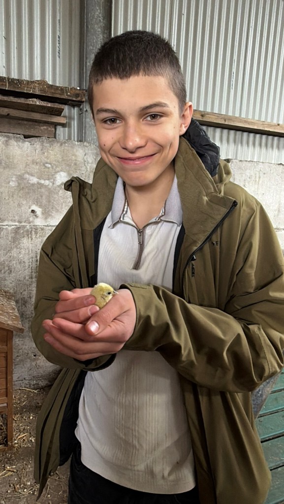 At Ryan’s request, we also spent some time with the chickens. Kitty couldn’t resist playing a prank, convincing him that a chicken had laid an egg right into his hand, which had all of us laughing. She then showed us a group of chicks that had hatched just the day before. They were impossibly small and so cute! We’ve never seen chicks so tiny.