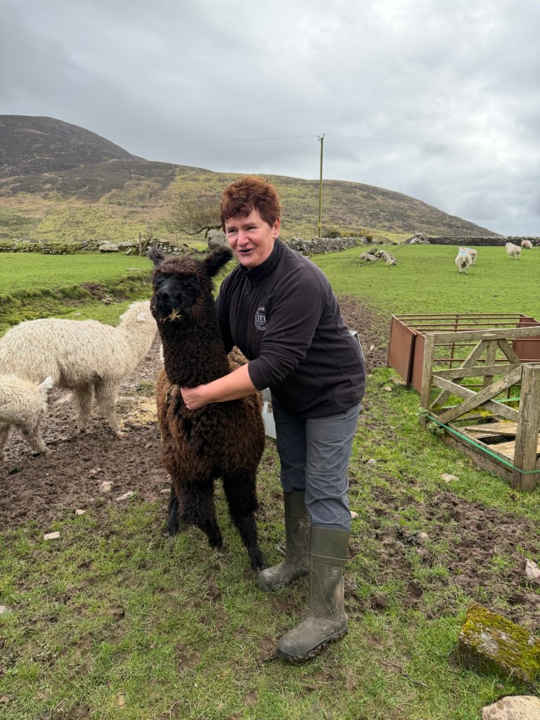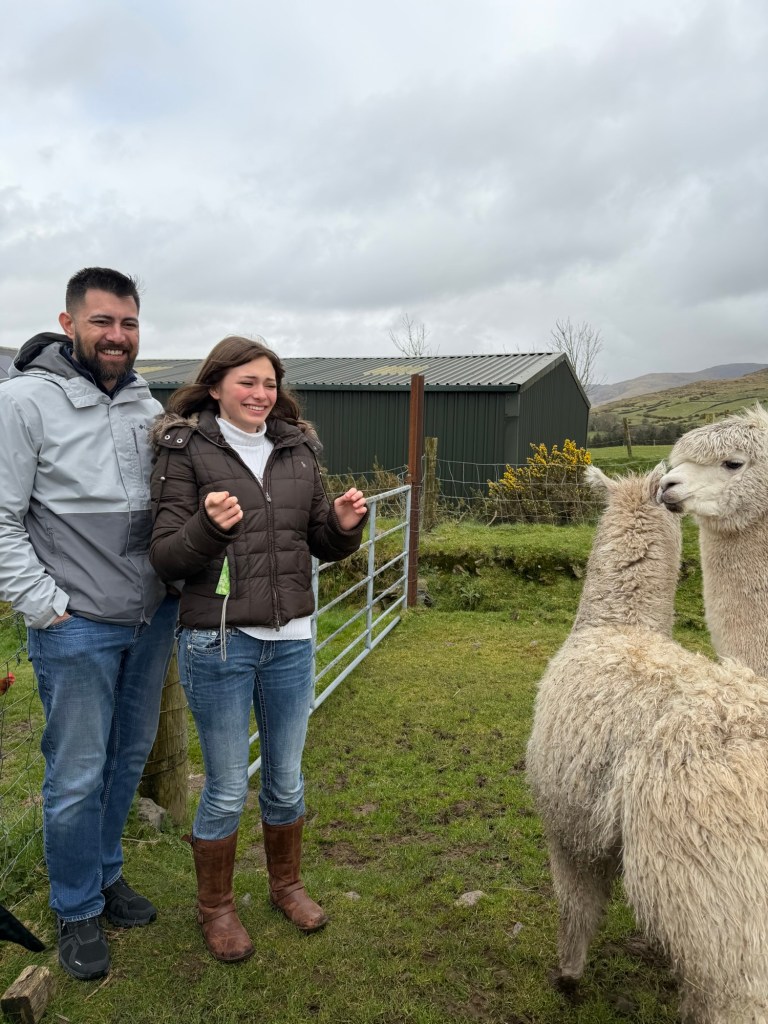 Before we left, Kitty led us out into the field, where the rest of the animals were waiting. A flock of sheep came running toward us, joined by a group of curious alpacas. As we stood there surrounded by them, she talked about how much farming in Ireland has changed. Wool, once a cornerstone of the economy, has lost so much value that some farmers now burn it rather than sell it. Today, sheep are raised mostly for meat, a shift that quietly reflects changing times and traditions.