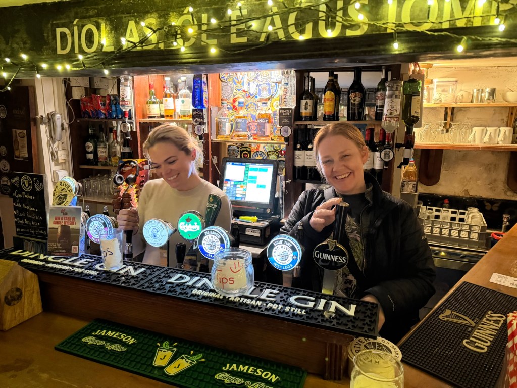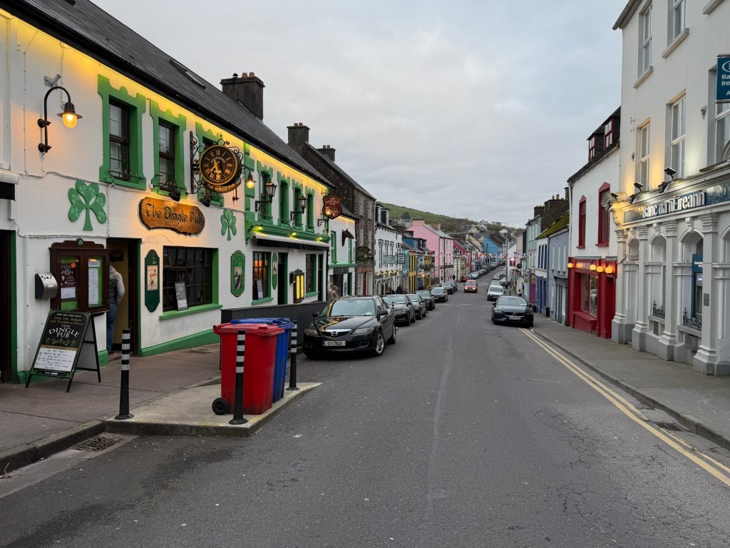 After settling in, we discovered we had a washer and dryer yet again, so another round of laundry was set in motion before we headed out for dinner. The town was buzzing with energy, far more lively than Kinsale or Kenmare had been. Even on a Wednesday night, the streets were full, the pubs were packed, and live music spilled out onto the sidewalks. We later learned that Dingle is a favorite not just for tourists but for locals as well, especially for celebrations like hen and stag parties. With its constant music and easygoing atmosphere, it felt a bit like Ireland’s answer to Nashville.