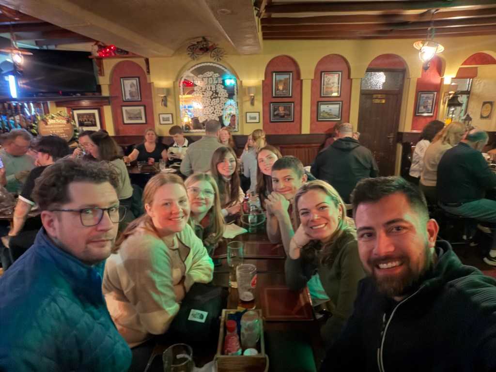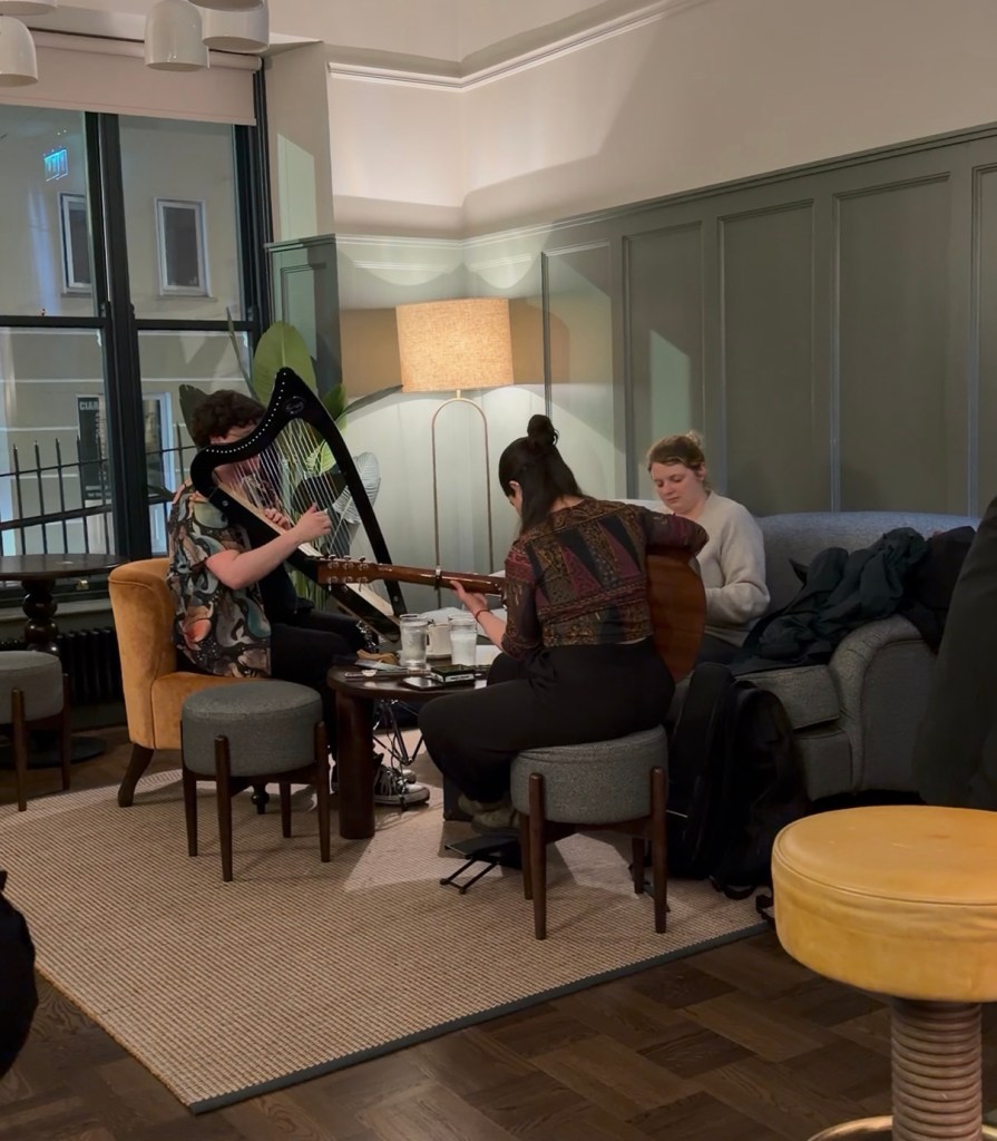 That decision paid off. A live group was playing, with a guitarist, harpist, and accordion player, their music filling the room with that unmistakable Irish energy. I posted a video on Instagram, and the next morning a friend messaged me to say the harpist was someone she knew. Once again, the world felt surprisingly small.