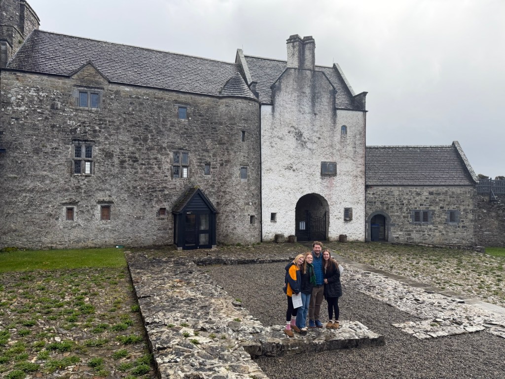 From there, we continued to Parke’s Castle, another site with deep ties to the O’Rourke family. Originally their stronghold, it was taken by Elizabeth I in the 1500s after they supported the Spanish Armada and later given to the Parke family. The castle, set along the water, is beautifully preserved. When we arrived, the rain was coming down hard, so we hurried inside to explore. By the time we finished, the sun had come out, casting a completely different light over the grounds and giving us the chance to take some beautiful photos.