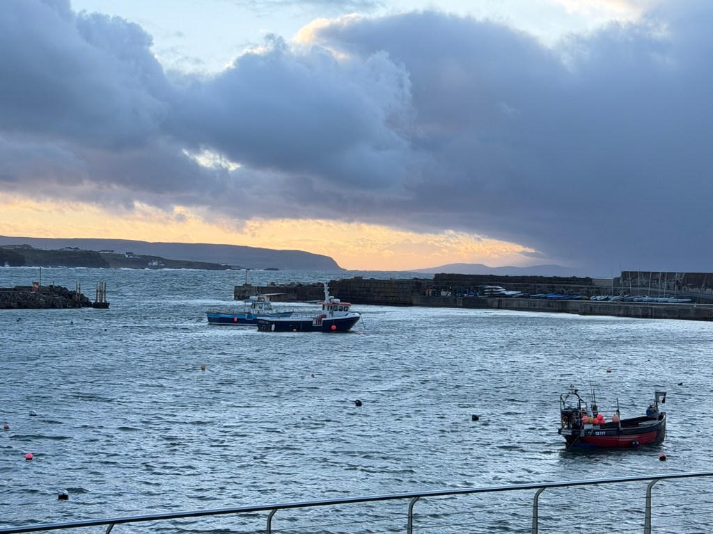 Next we had lunch at the Harp Tavern in Sligo to warm up for the next part of our journey. We then made our way toward Northern Ireland. The border was so subtle we barely noticed crossing it, and soon we arrived in Portrush, where we would spend the night. After checking in, we went for a walk through town, did a bit of shopping, and naturally, set out to find the oldest pub. We eventually found it, packed and lively, but managed to squeeze in upstairs for a round of drinks.